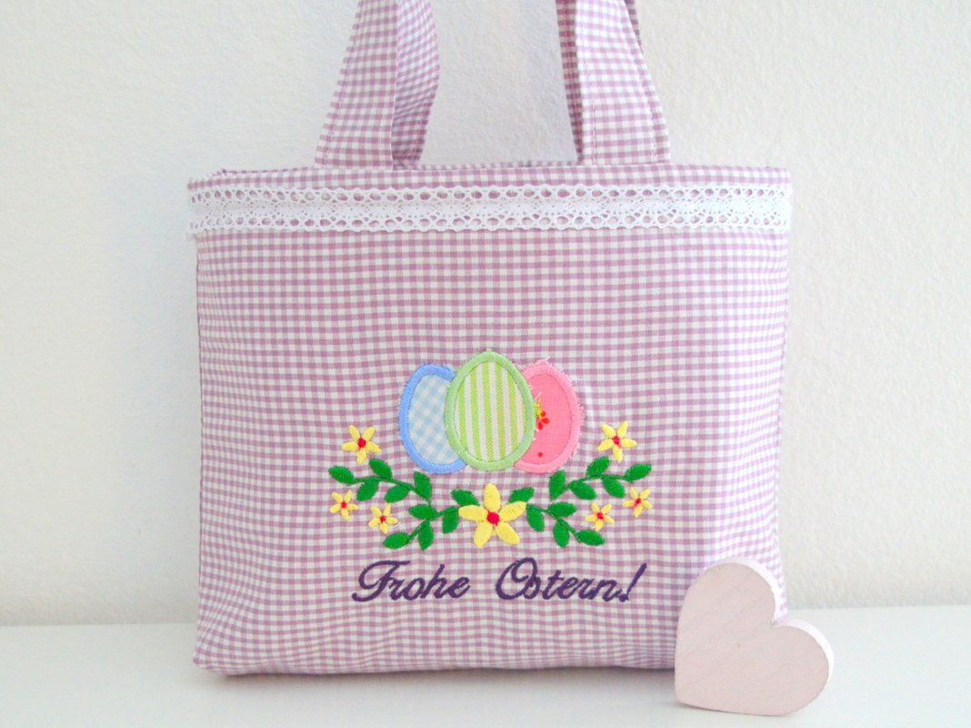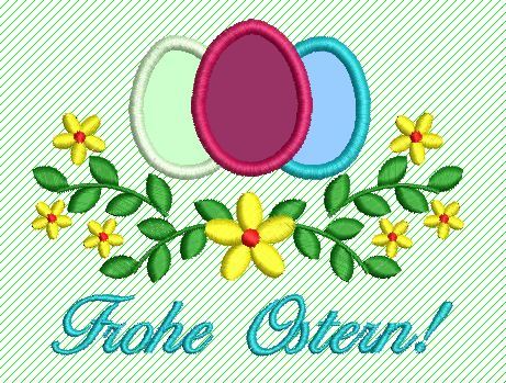 Stickdatei Ostereier Applikation mit Blumenranke und "Frohe Ostern!"