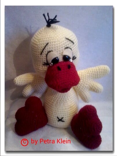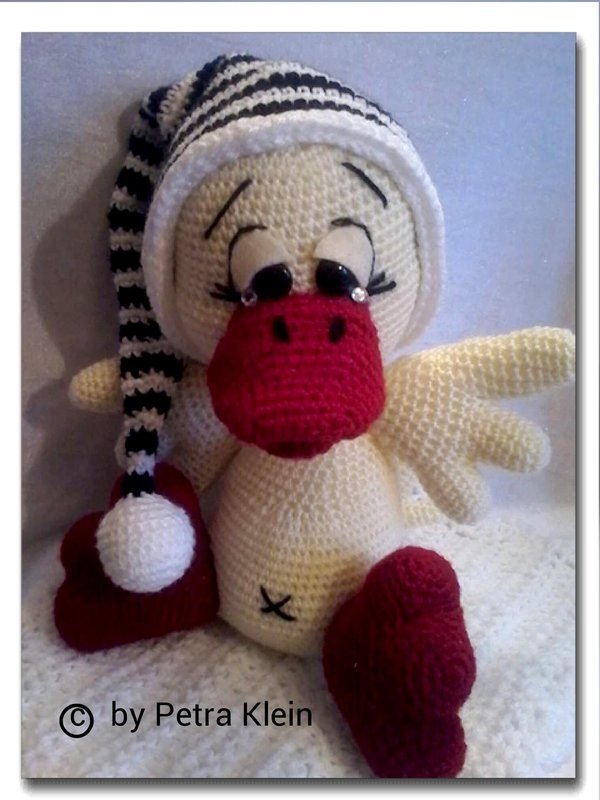 Diese Anleitung ist 21 Seiten lang und beinhaltet die Ente sowie auch die Mütze und das Schmusetuch. In der Anleitung befindet sich eine Materialliste und ein Foto - sowie ein Zeichenerklärungsblatt. Diese Anleitung ist handgeschriebenen und mit liebevollen Zeichnungen versehen. Ich habe die Ente mit einer 2,5 Häkelnadel und der dazu passenden Wolle gearbeitet und sie hat bei mir eine Größe von 25 cm .