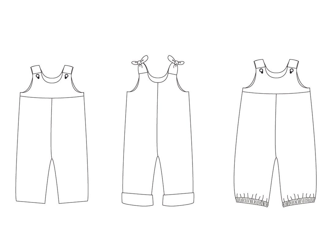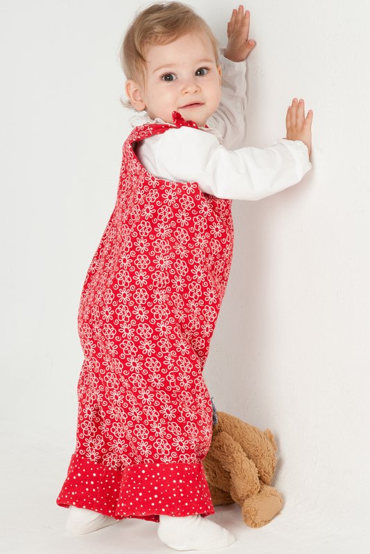 – Variante C: langer Overall mit gefüttertem Latz, Knopf-Trägern und Gummizug am Saum