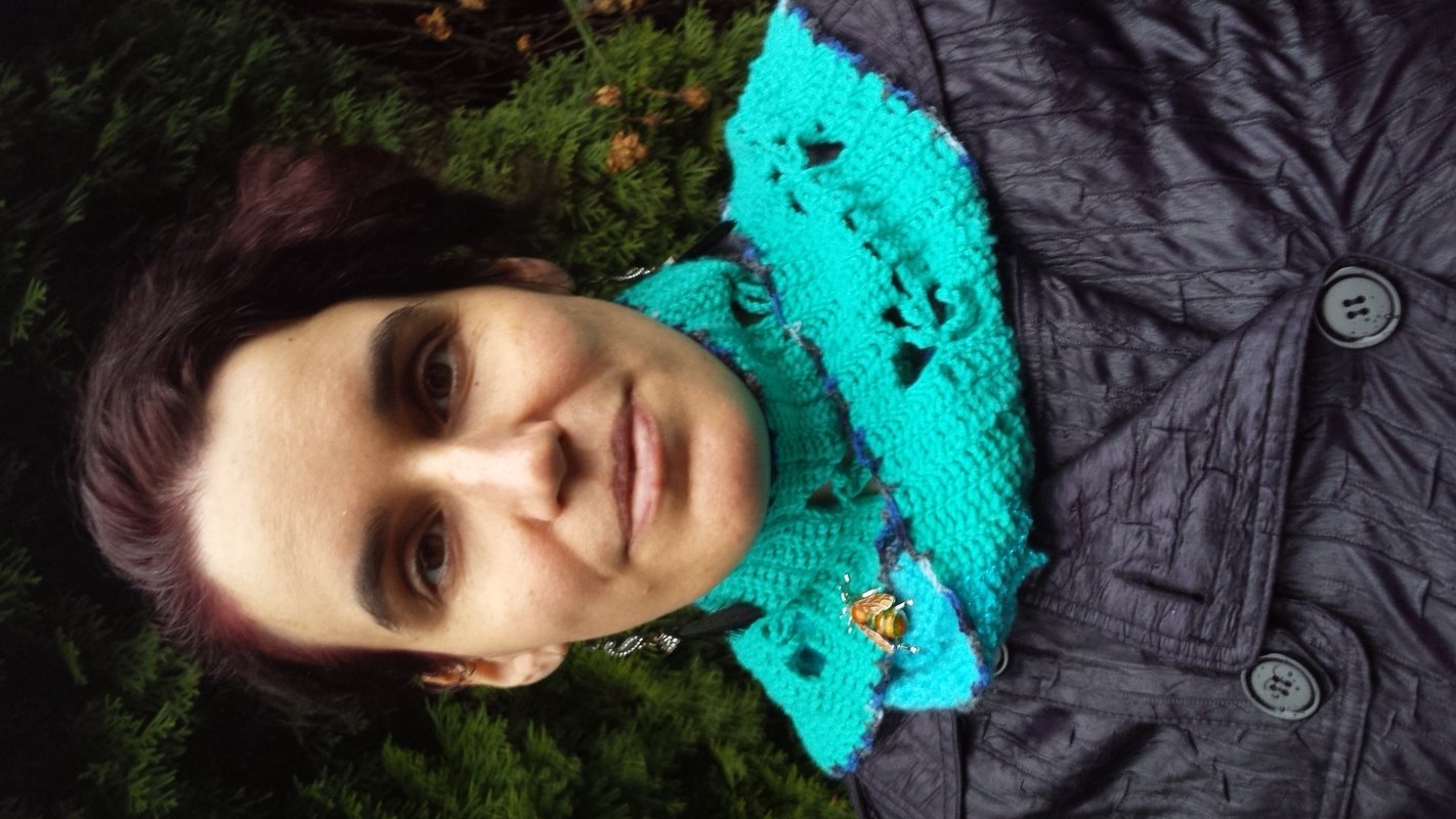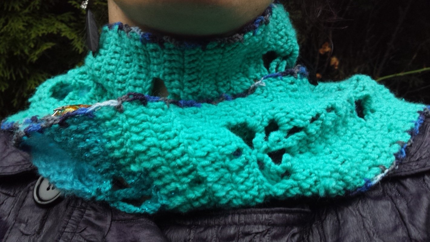 150 gr Wollreste ( Stärke 3 ) in kalten Farben. Ich habe Acrylgarn verwendet, aber auch weichfallende Garne aus Seide, Merino oder Bambus sind denkbar.