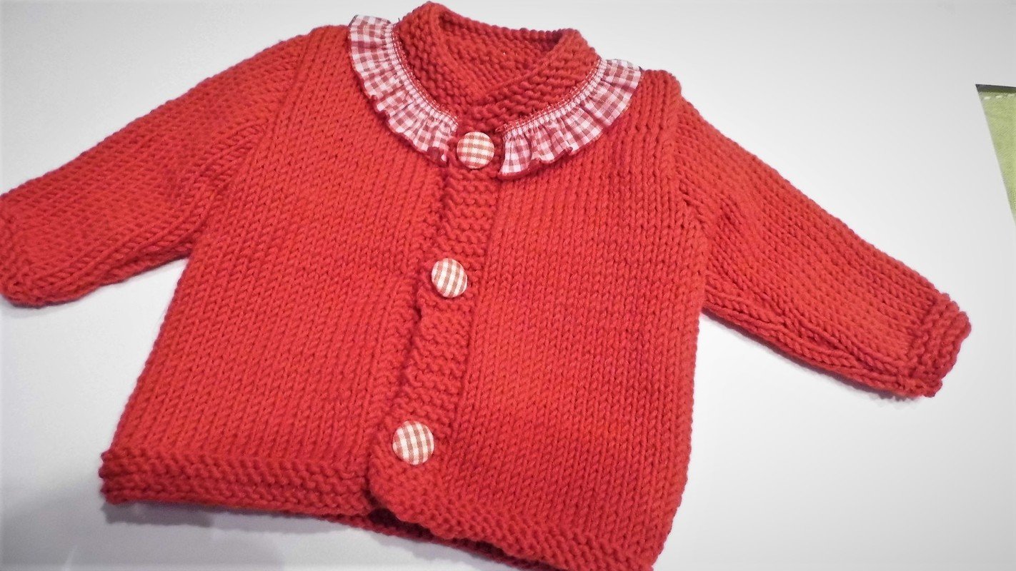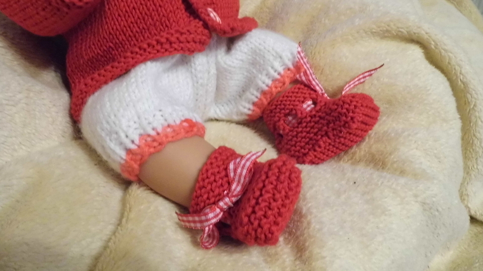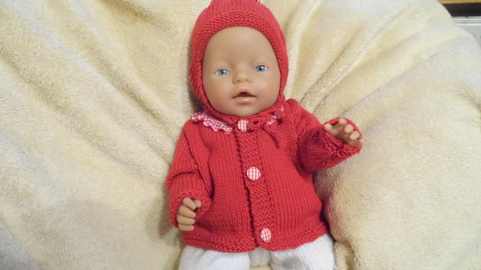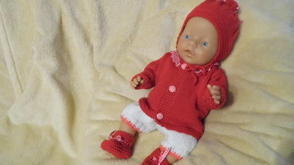Strickanleitung für Babypuppengarnitur aus Jacke Mütze und Socken in einem tollen Rot und ganz einfach nachgearbeitet