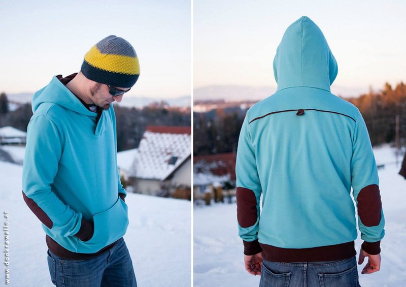 Der Pulli erhält seinen besonderen Stil durch die klassische Unterteilung am Rücken, die Armpatches und eine lässig aufgesetzte Bauchtasche.