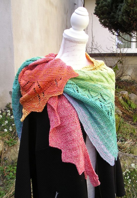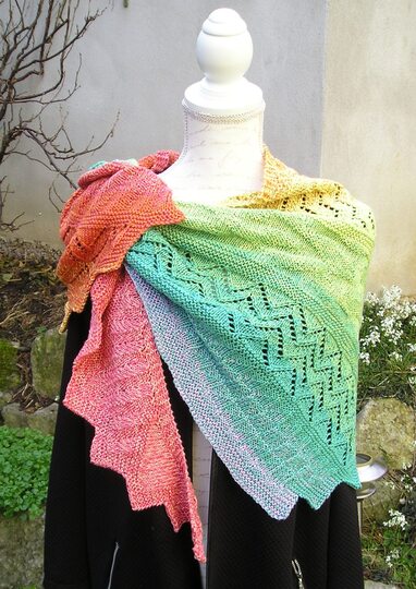 Das Tuch wird mit einem Farbverlaufsgarn gestrickt. Man beginnt an einem Zipfel und nimmt an der rechten Tuchseite Maschen zu, damit es in die Breite und die Höhe wachsen kann. auf der linken Tuchseite werden Zacken gestrickt. Das Tuch besteht aus Streifen mit Lochmustern und und Streifen mit Mustern aus rechten und linken Maschen. Ein kraus rechts gestrickte Rand wird gleich mit gearbeitet, so dass das Tuch zum Schluss nicht mehr umhäkelt werden muss. Die Anleitung enthält Strickschriften für die einzelnen Muster.
