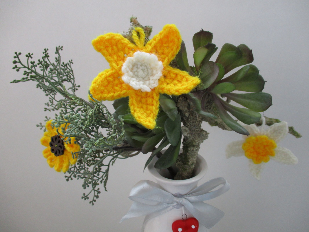Mit dieser Anleitung schnell und einfach nachzuhäkeln ,können die Blüten vielseitig verwendet werden zb.als Anhänger für den Osterstauß, für die Ostertafel auf dem Tisch verstreut , als Geschenkanhänger oder als kleines Mitbringsel .
