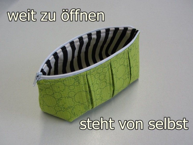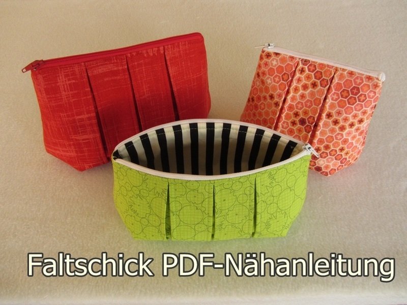 Nähe deine eigene, edle Falten-Kosmetiktasche! Sie steht von selbst, lässt sich weit öffnen und der Reißverschluss ist perfekt eingenäht, ohne störende Nähte oder offene Kanten.