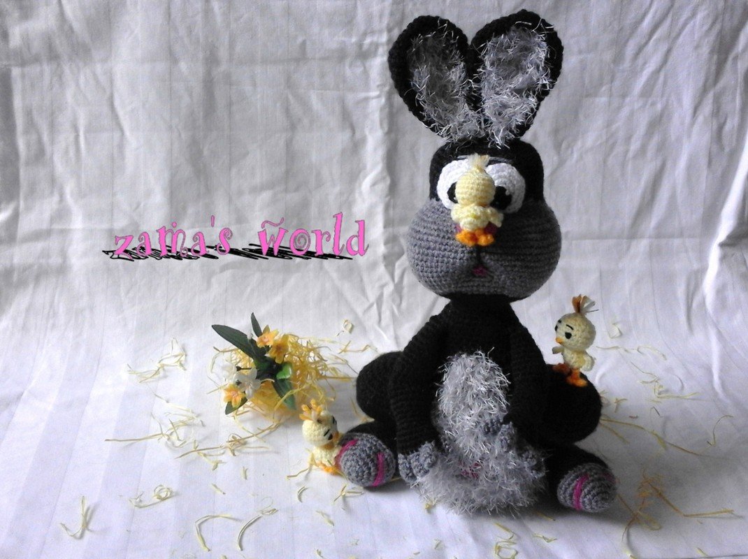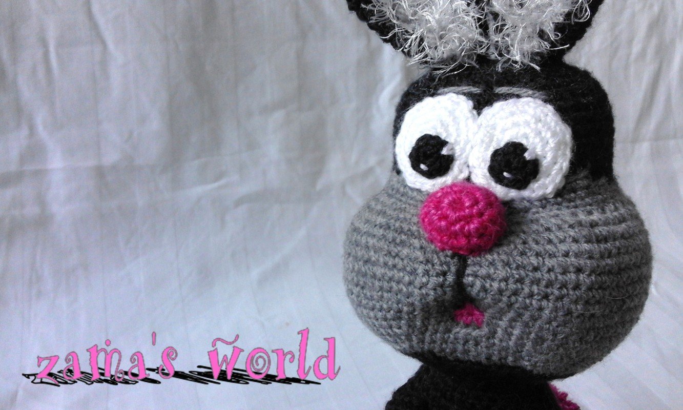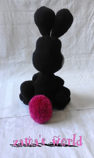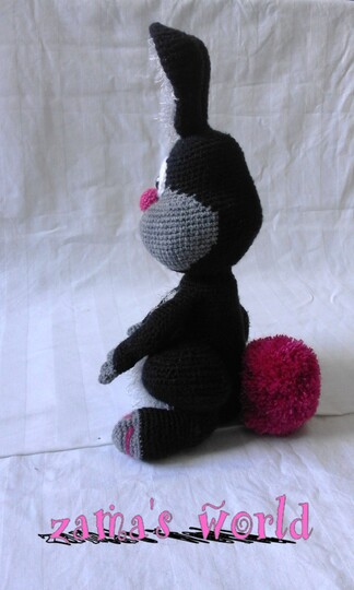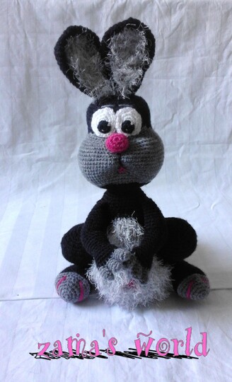 Mein Rabbo misst circa 33 cm (bis zu den Ohrenspitzen gemessen) und wurde mit einer Häkelnadel der Stärke 1,50 gefertigt.