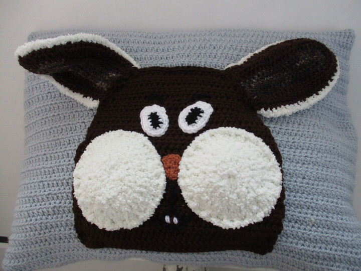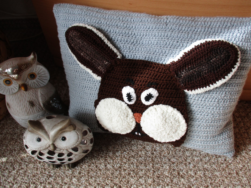 Ich habe hier ein einfaches Kissen gehäkelt und das gehäkelte Hasengesicht aufgenäht.,