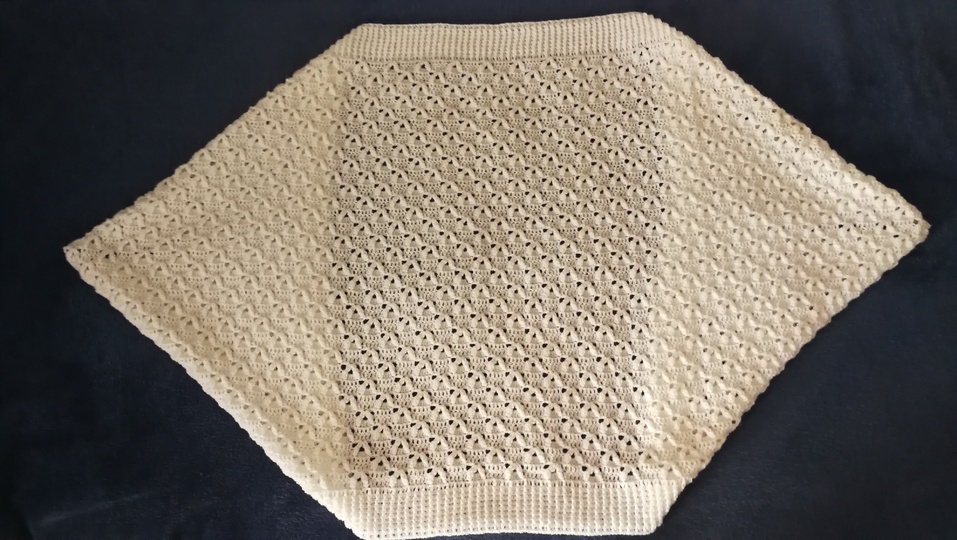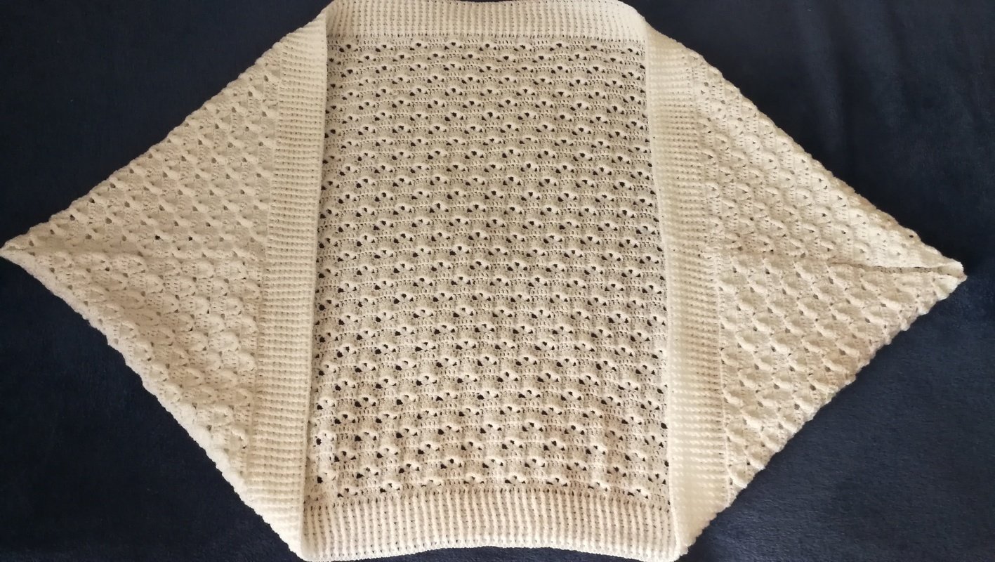 Er wird von oben nach unten in einem Stück gehäkelt in rechteckiger Form.