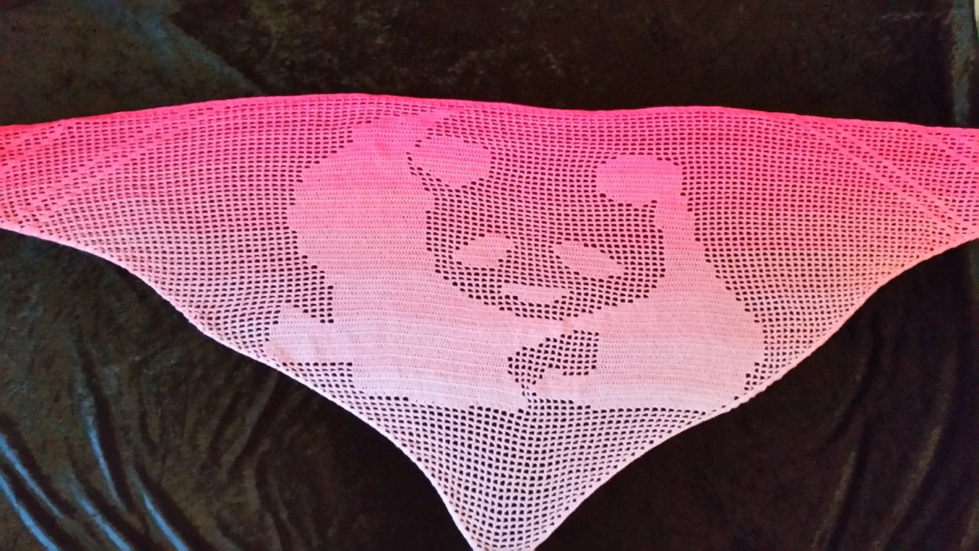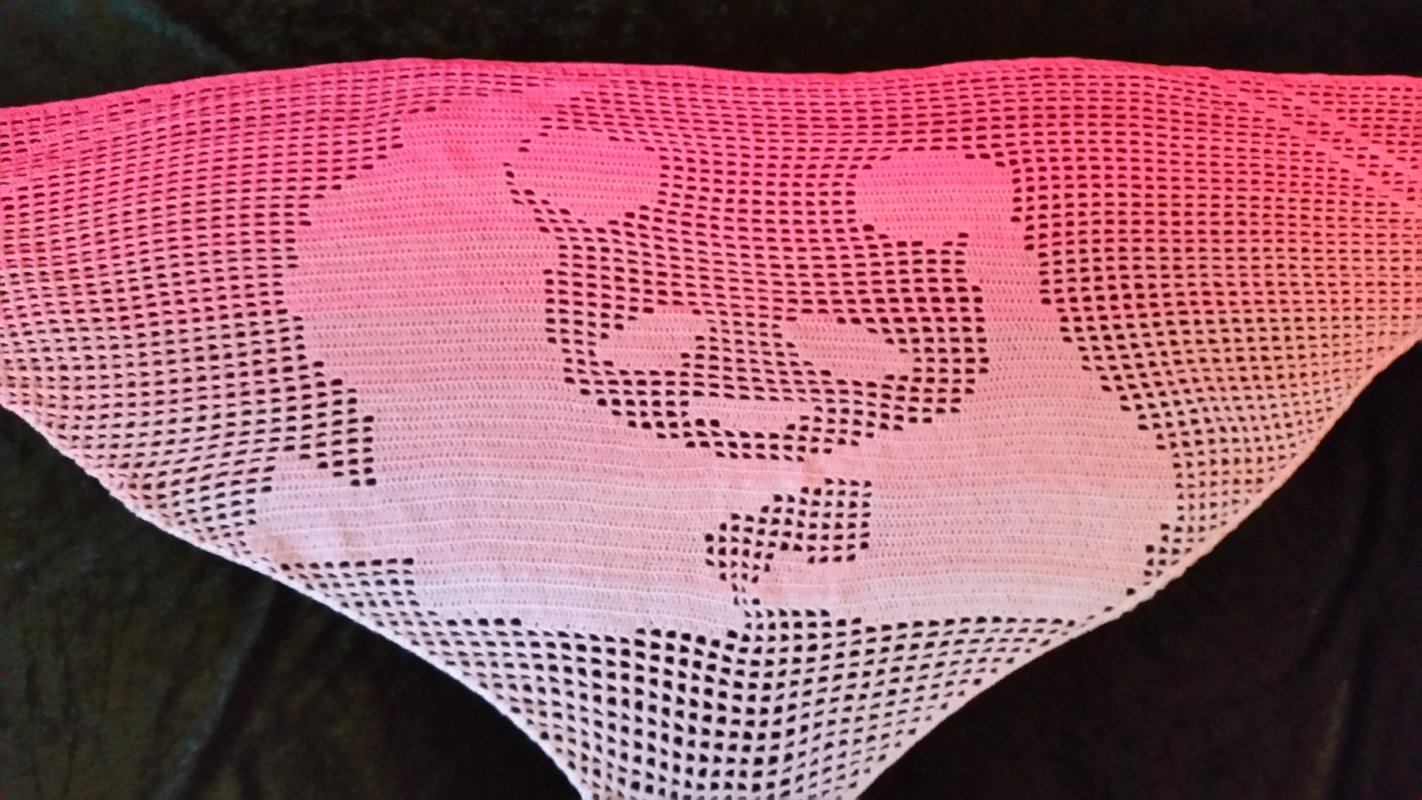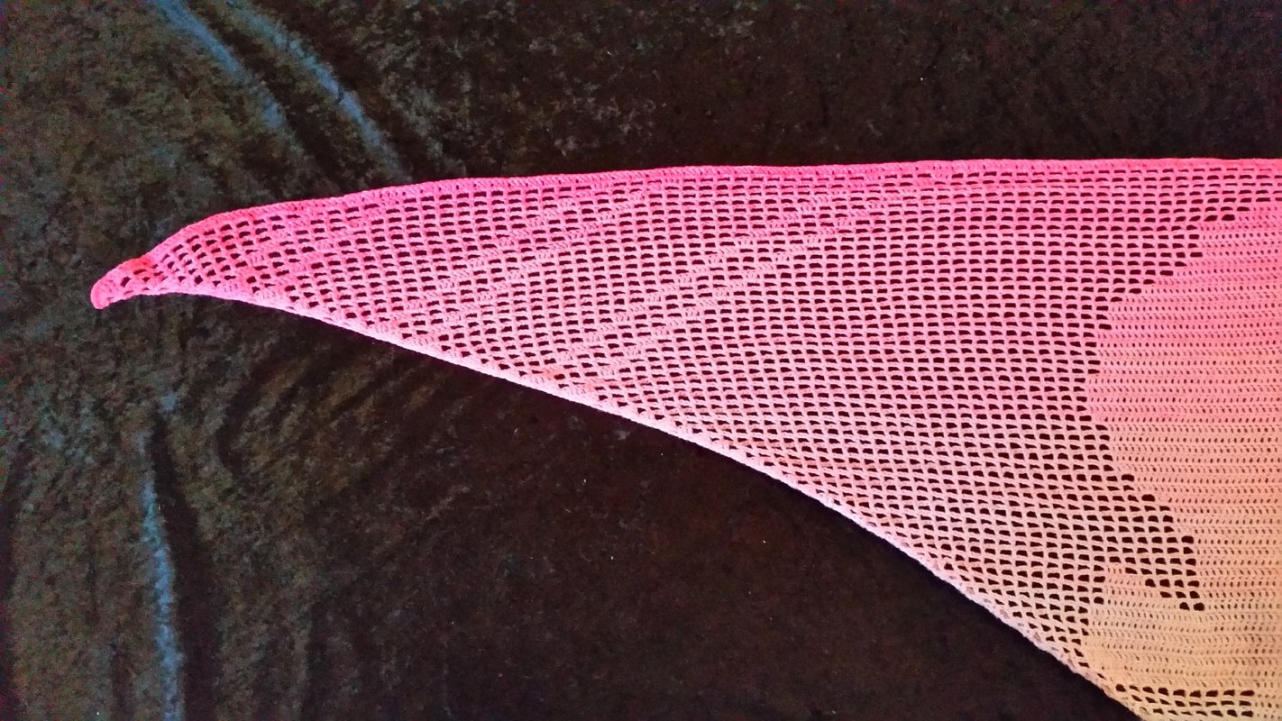 Ich habe das Motivtuch mit einem dreifädigen Farbverlaufsgarn gehäkelt, welches ich selbst gewickelt habe. Verwendet wurde ein Bobbel mit 1100m Lauflänge. Gehäkelt wurde mit einer Häkelnadel mit der Stärke 3,0.
