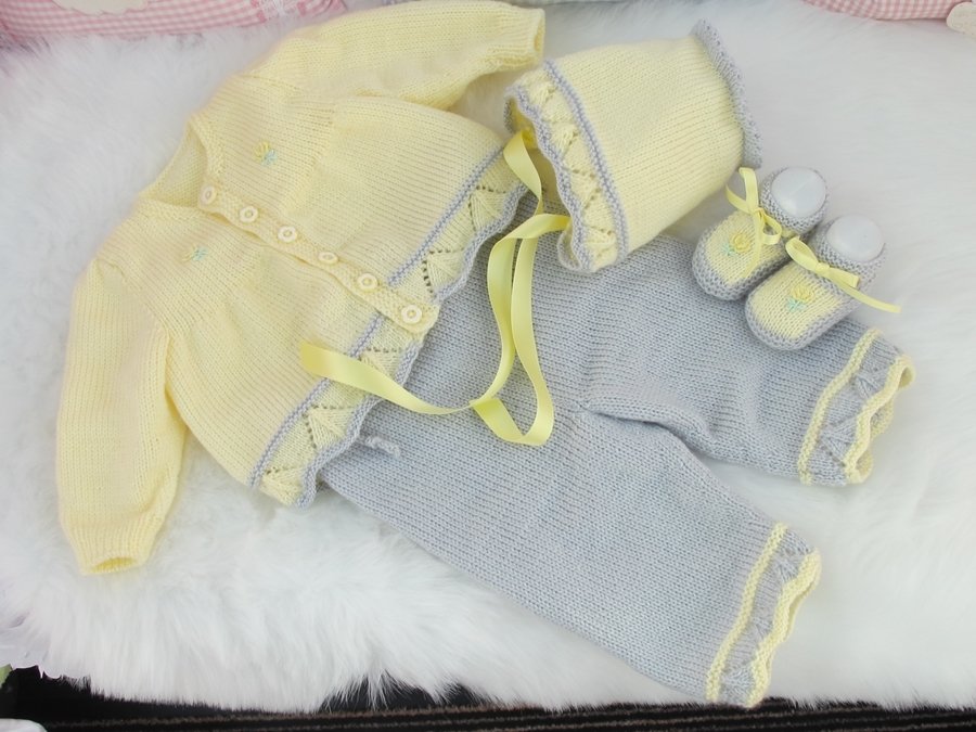 Strickanleitung für ein wunderschönes Set, 4-teilig für Babys & Reborns, Gr. 50 Das Set ist aus Babywolle von ON LINE gestrickt. Die Anleitung ist sehr genau beschrieben und mit vielen Fotos