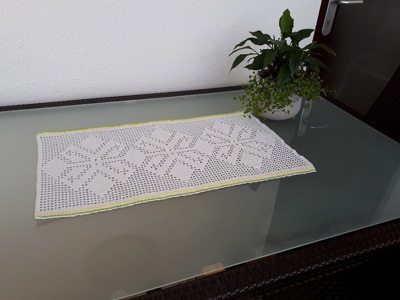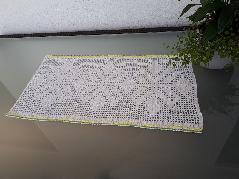 Eine kleine Filethäkelschule über die Fertigkeiten die du für diesen Tischläufer benötigst ist enthalten!