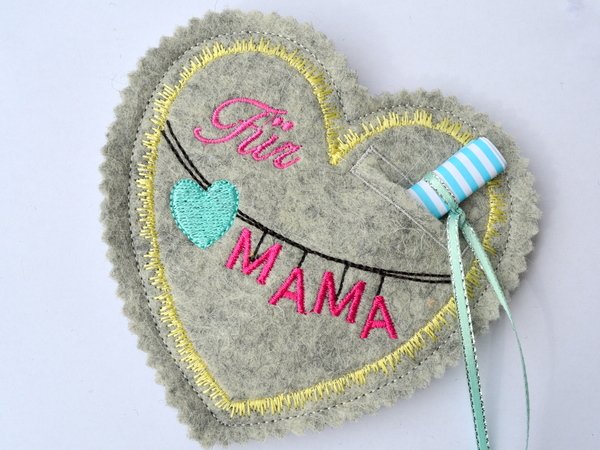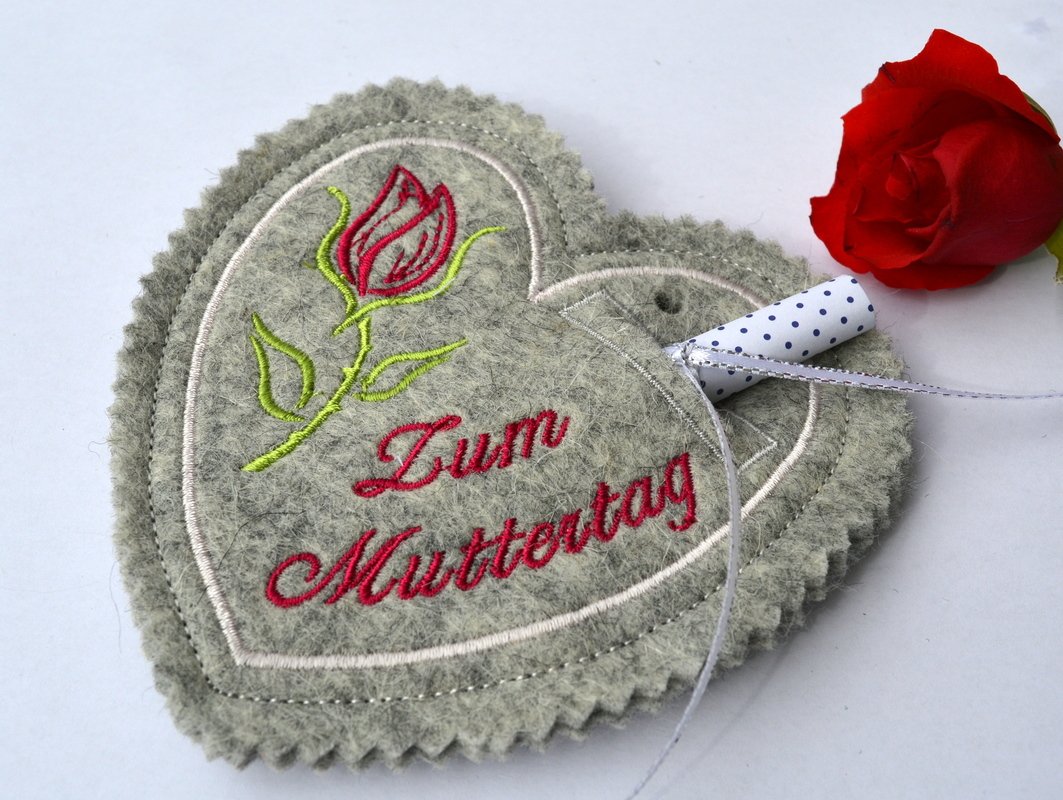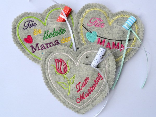 Süße Stickdatei Herz zum Muttertag als Anhänger, um Botschaften, Glückwünsche, Nachrichten oder auch Geldgeschenke zu verschenken.