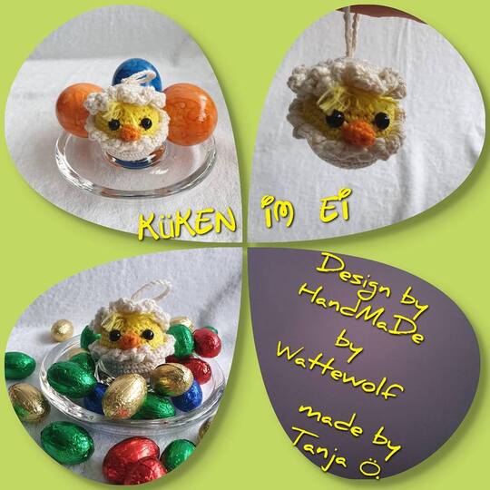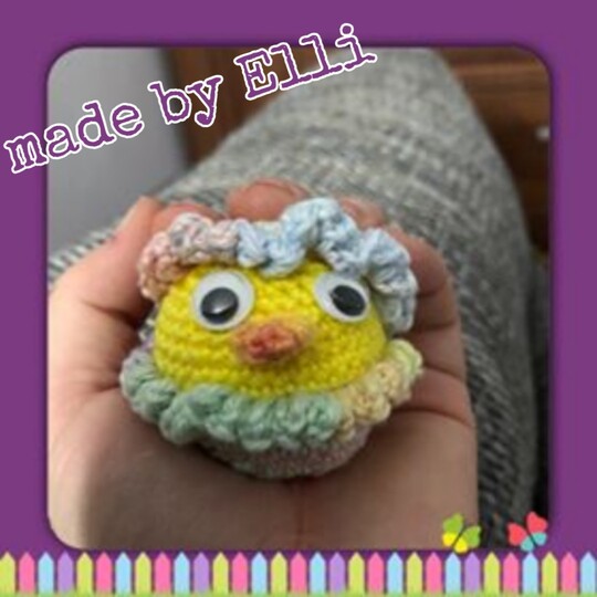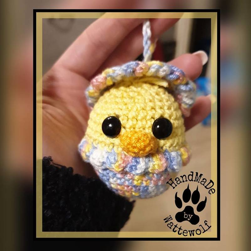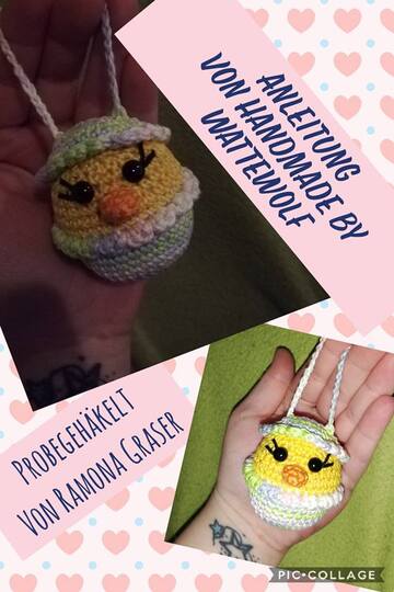 Das Küken ist mit der angegebenen Wolle ca.6 cm groß. Dies variiert natürlich je nach Wolle, Nadelstärke und ob du fest oder locker häkelst.