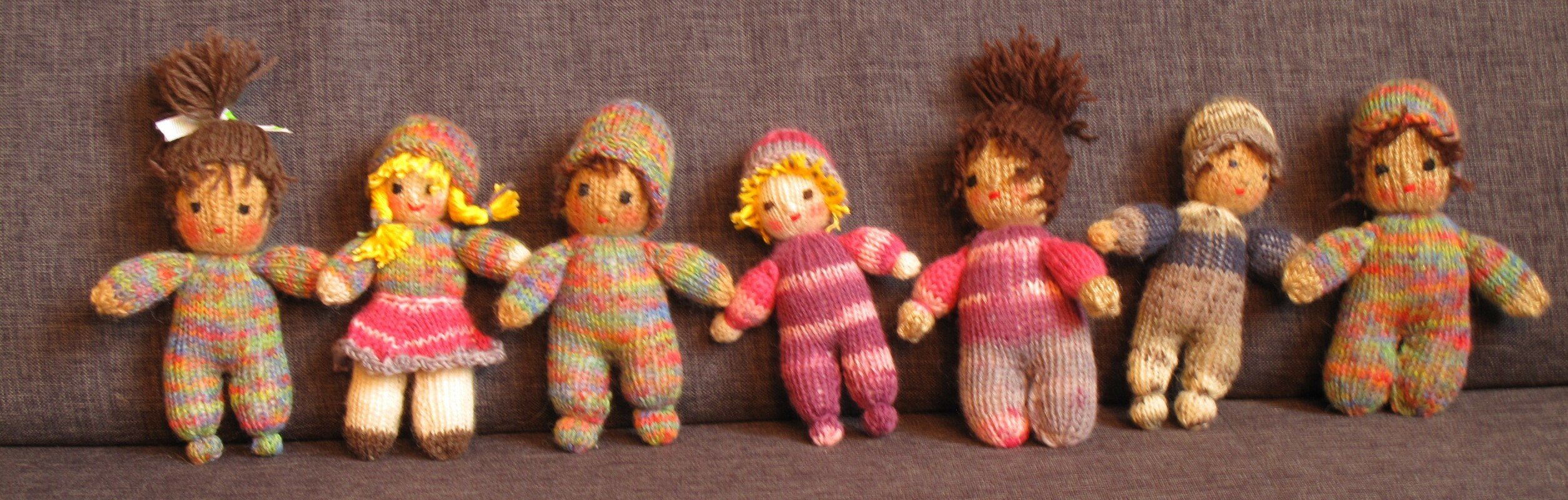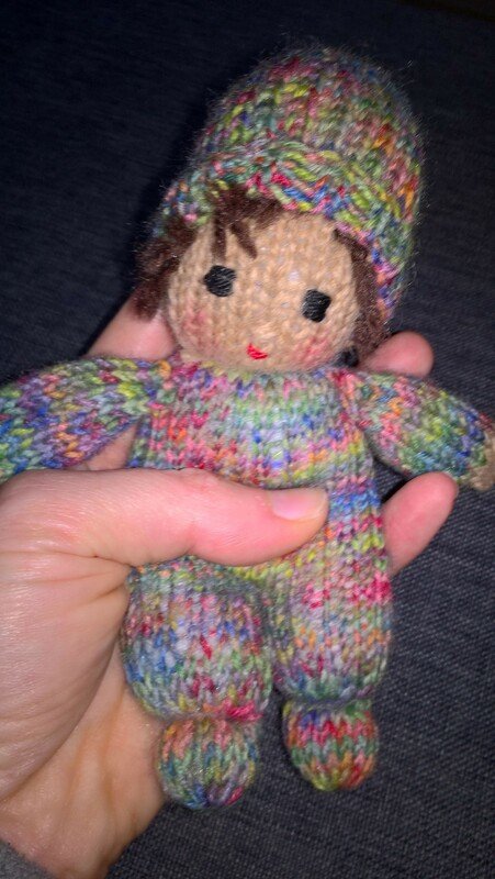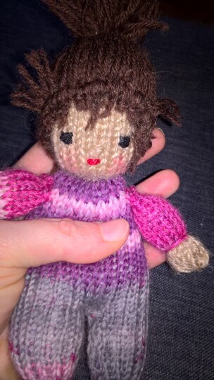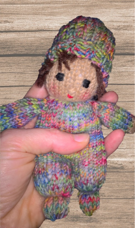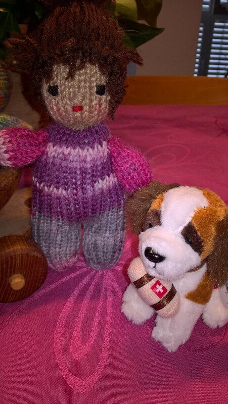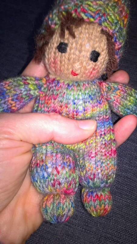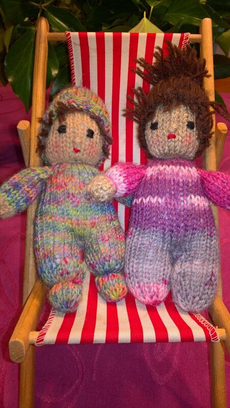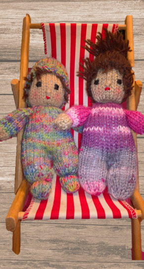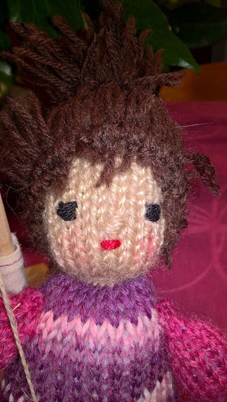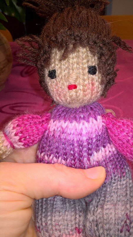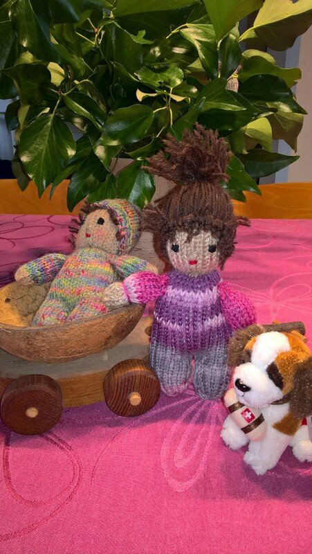 Die Größe ist abhängig von der verwendeten Wolle. Ich habe mit klassischer Sockenwolle und Stricknadeln der Stärke 2,5 gearbeitet. Dann haben die Püppchen eine Größe von ca. 15 cm.