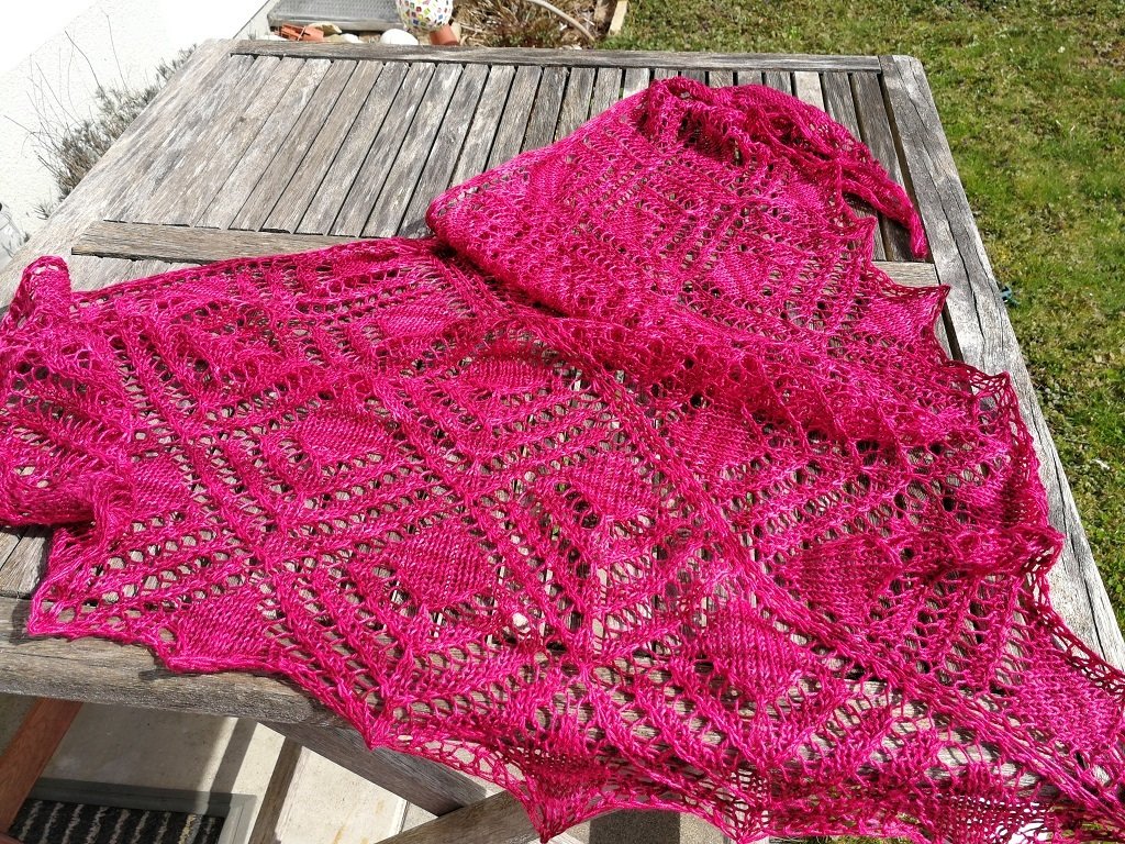 Das Dreieckstuch wird in der oberen Mitte begonnen und in einem durch gestrickt. Es eignen sich nicht nur handgefärbte Garne, sondern auch luftige Bobbelwolle im Farbverlauf. Die Farben sind nur ein Vorschlag, der an die Vielfalt der Blüten erinnert. Die Lauflänge kann aufgrund des Endlosmusters gerne variieren.