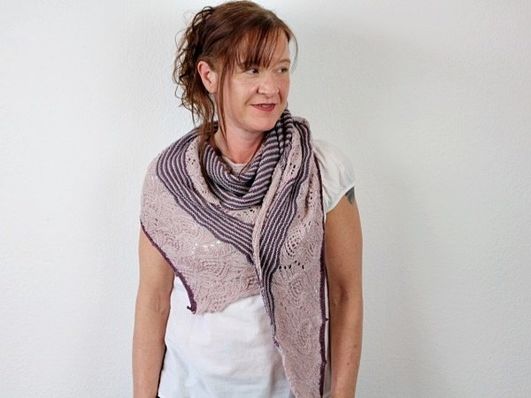 Das Tuch „Sugar“ wird an einem Stück und ohne Nähte gestrickt. Entspannte Streifen wechseln sich mit einem etwas anspruchsvolleren Lacemuster ab, dass ein wenig Konzentration erfordert.