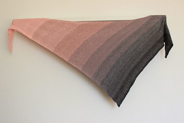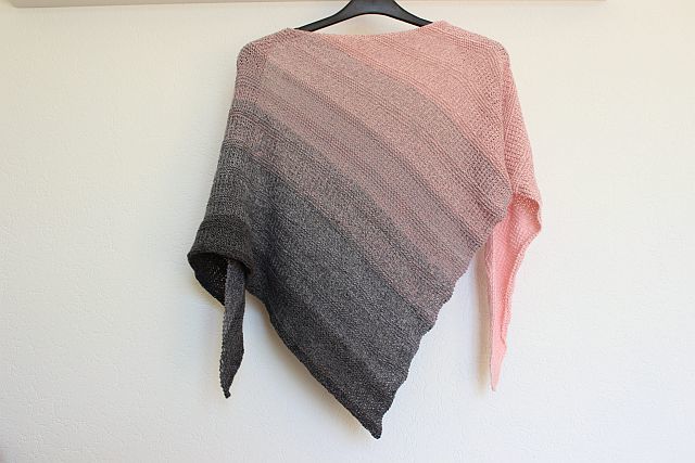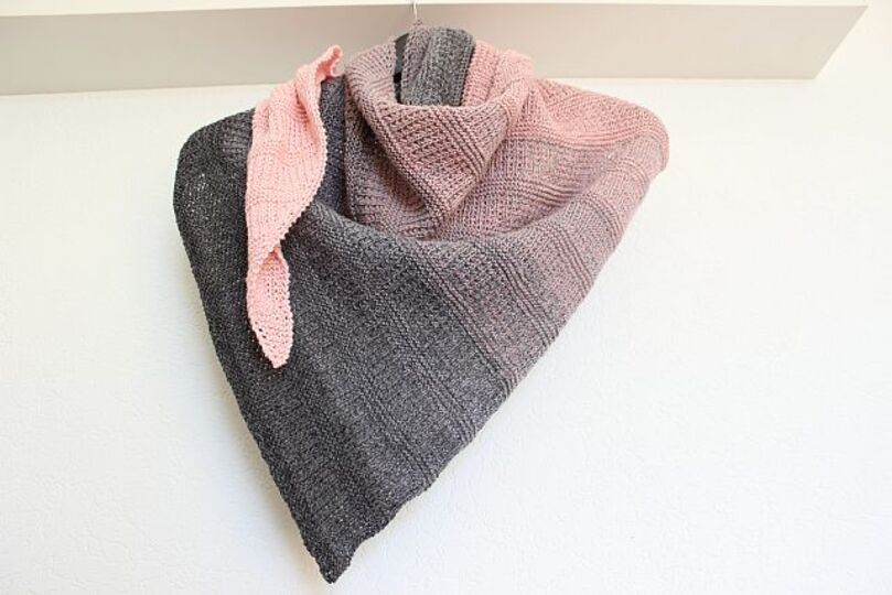 Es ist ein asymmetrisches Dreiecks-Tuch mit einem einfachen Strick-Muster, das von beiden Seiten interessant aussieht und auch beidseitig getragen werden kann.