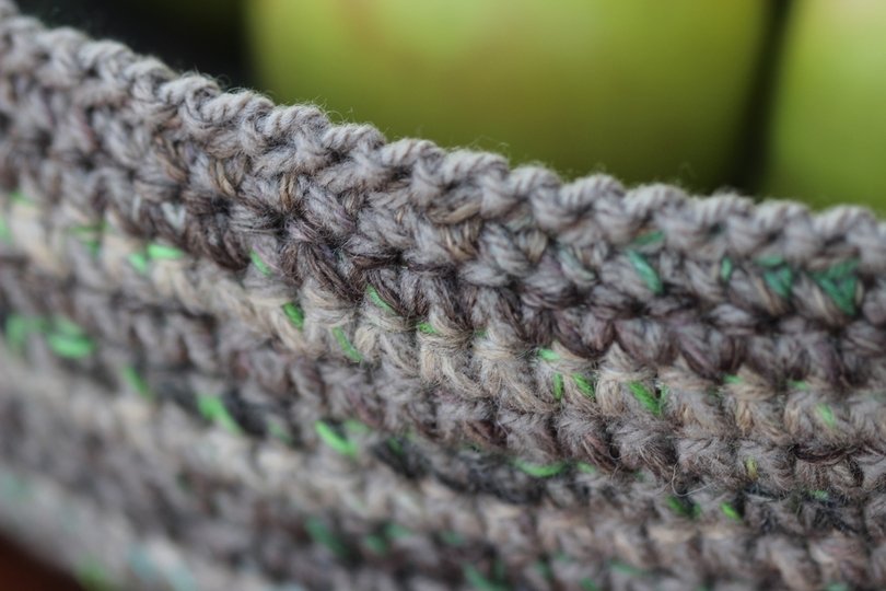 Er ist Dank einer eingearbeiteten Plastik-Wäscheleine, die unsichtbar spiralförmig mitläuft, stabil und formtreu. Er lässt sich ganz easy häkeln, denn wir häkeln nur feste Maschen immer rundherum. Das bekommt jeder hin. Deshalb ist diese Anleitung auch sehr gut für Häkelanfänger geeignet.