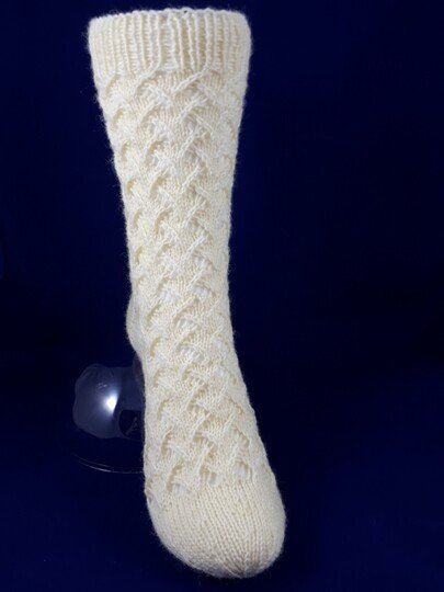 Die Socke wird mit Nadelspiel 3 mm gearbeitet und passt den Schuhgrößen 35-38.