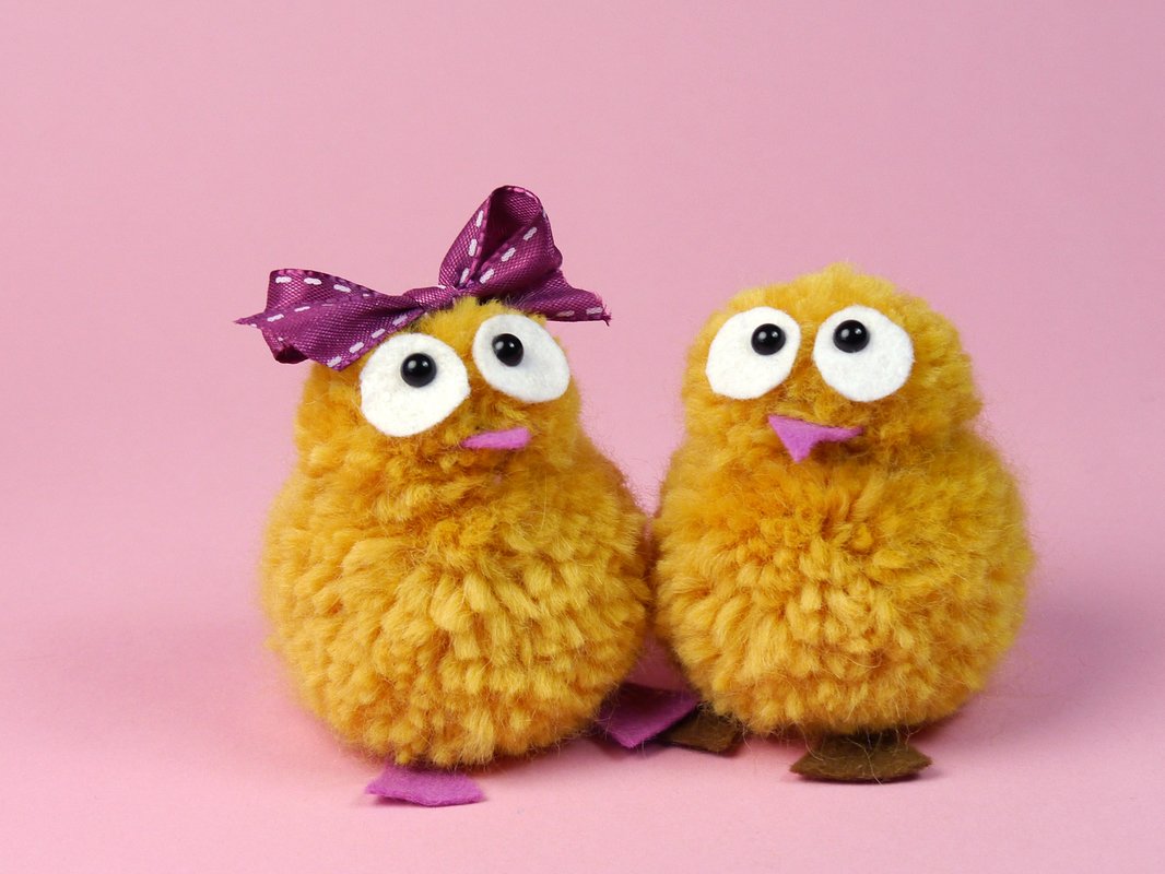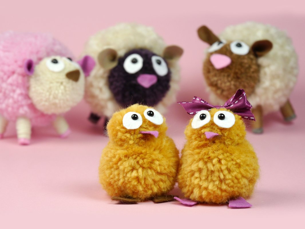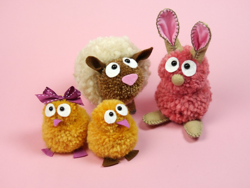 Schäfchen, Küken und der Osterhase gehören einfach auf jeden festlichen Ostertisch! Sie können die Tiere einfach nacharbeiten, die meisten Zutaten haben Sie wahrscheinlich schon zuhause. Wühlen Sie sich durch Ihre Wollrestekiste – da findet sich bestimmt etwas Passendes! Sie können dabei alle Wollqualitäten munter mixen. Selbst manche Acrylwolle entfaltet ihren ganz eigenen Reiz, wenn sie zu bunten Bommeln verarbeitet wird. Die Tierchen eignen sich nicht zum Spielen, da die Pompons in Kinderhänden leicht zerfleddern, deshalb wird hier auch mal geklebt und nicht genäht.