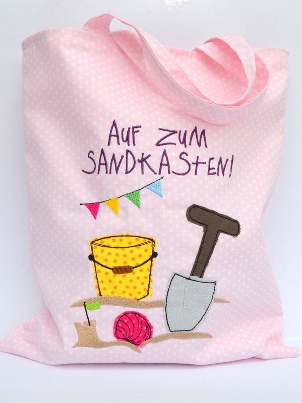 Süße Stickdatei Sandkasten "Auf zum Sandkasten", ideal für Beutel, um Sandspielzeug zu verstauen.