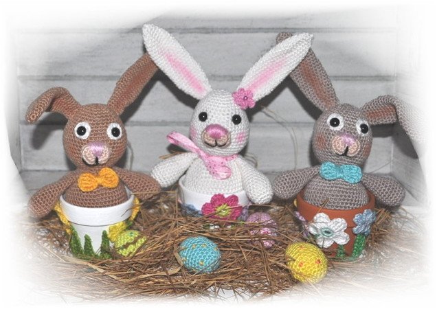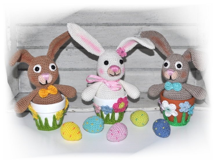 Der Hase wurde ohne Beine gehäkelt, da er sich ins Töpfchen gesetzt hat :o)