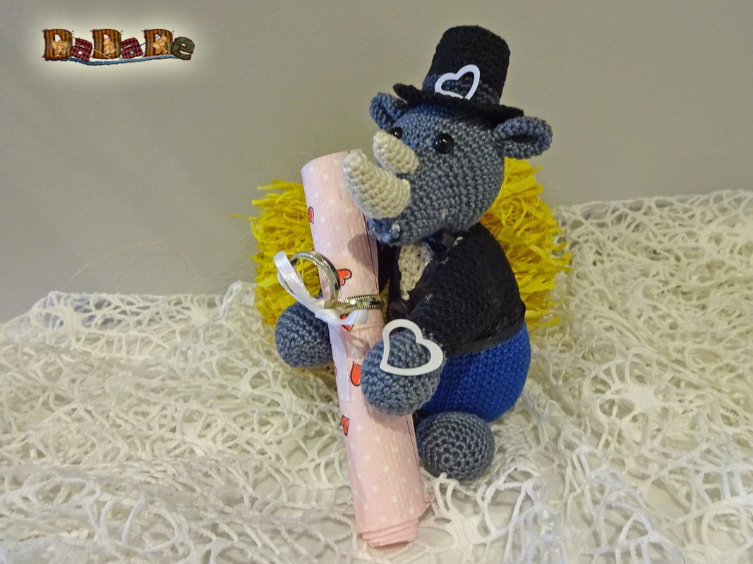 das Nashorn kann auch ein kleines Geschenk zwischen den Armen festhalten.