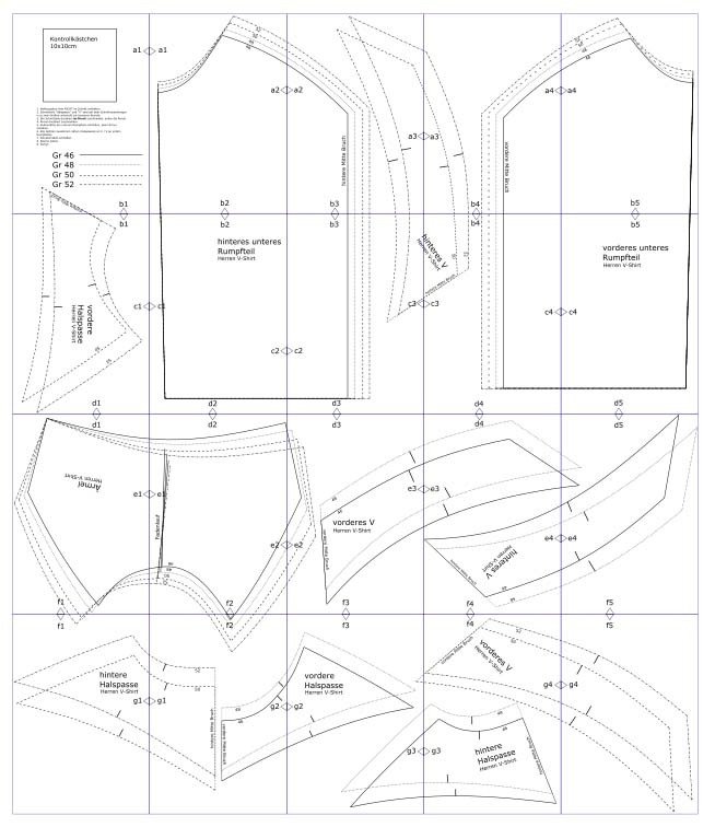 PDF Anleitung und Schnittmuster für ein Herren T-Shirt mit V-Bögen in den Größen 46-48-50-52.