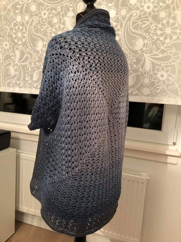 Ich habe für Konfektionsgröße 36 und einer Körpergröße vin 1,64m 1200m Lauflänge eines Farbverlaufgarns benötigt.