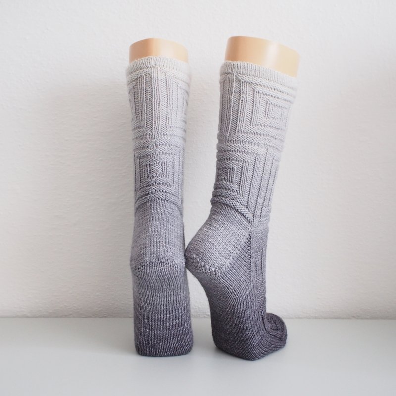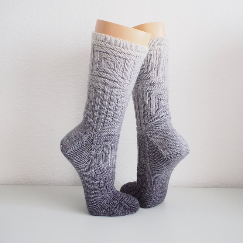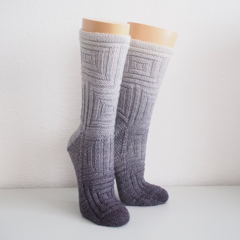 Klare Linien und plastische Strukturen zeichnen dieses Design aus. Von der Optik her erinnern die Socken an Quadrate, die ineinander verschachtelt und über-einander gestapelt sind.