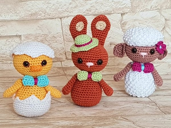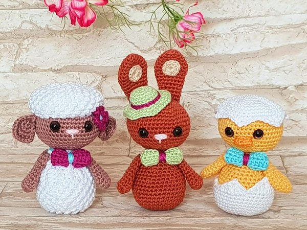 Diese lustige Bande freut sich schon riesig auf Ostern und darf in keinem Osternest fehlen: das freche Küken, das schicke Häschen und das süße Schäfchen.