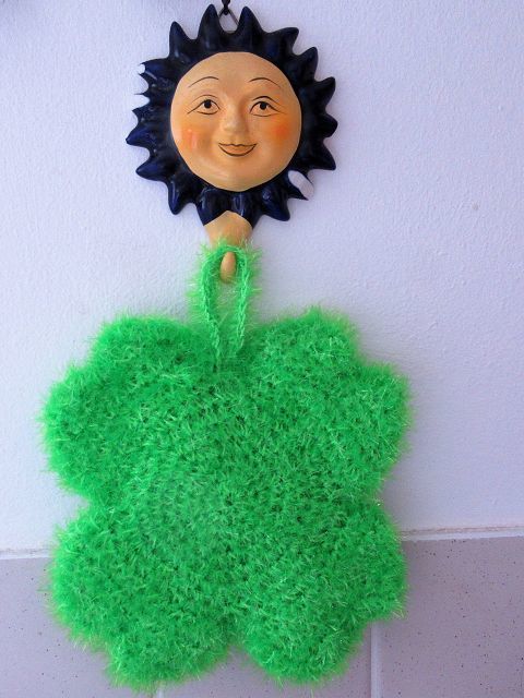 Das Glücksklee-Blatt wird aus Rico Creative Bubble gehäkelt, einem Garn, das speziell für Spül- und Badeschwämme entwickelt wurde. Das Garn ist etwas kratzig und deshalb sehr gut geeignet, um festsitzende Rückstände auf dem Geschirr zu lösen. Auch als Peelingschwamm lässt es sich prima verwenden.Es trocknet schnell und lässt sich bei 60°C in der Waschmaschine waschen. So kann der Schwamm immer wieder verwendet werden und bleibt hygienisch sauber.