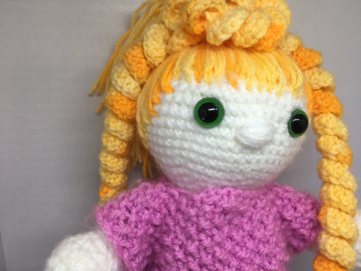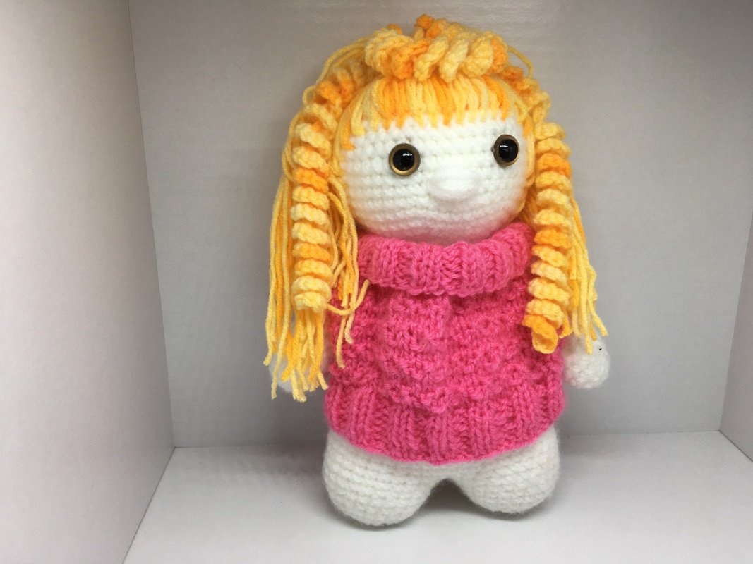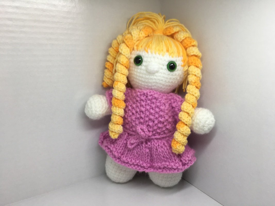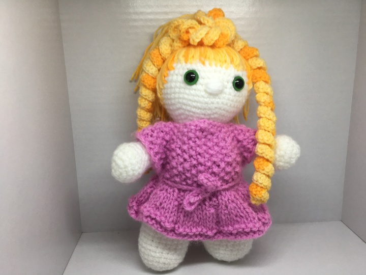Sie erhalten eine Häkelanleitung zum Häkeln von einer Puppe und zum Stricken von einem Puppenkleid für diese Puppe.