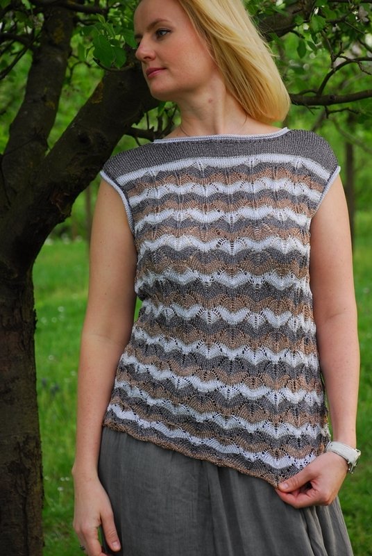 Die Strickanleitung zum Sommertop "Glamour" - ist am Stück gestrickt und hat nur zwei Schulternähte. Dank Ajourmuster hat das Top unten eine ungerade Kante und kann auch als Tunika getragen werden. Leicht glitzerndes, fliessendes, angenehmes Garn passt perfekt für stillvolle Auftritte am Tag sowie am Abend. Figurbetont und feminin, tragbar solo oder leicht kombinierbar mit einem T-Schirt oder Hemd.