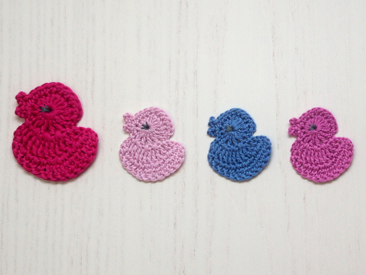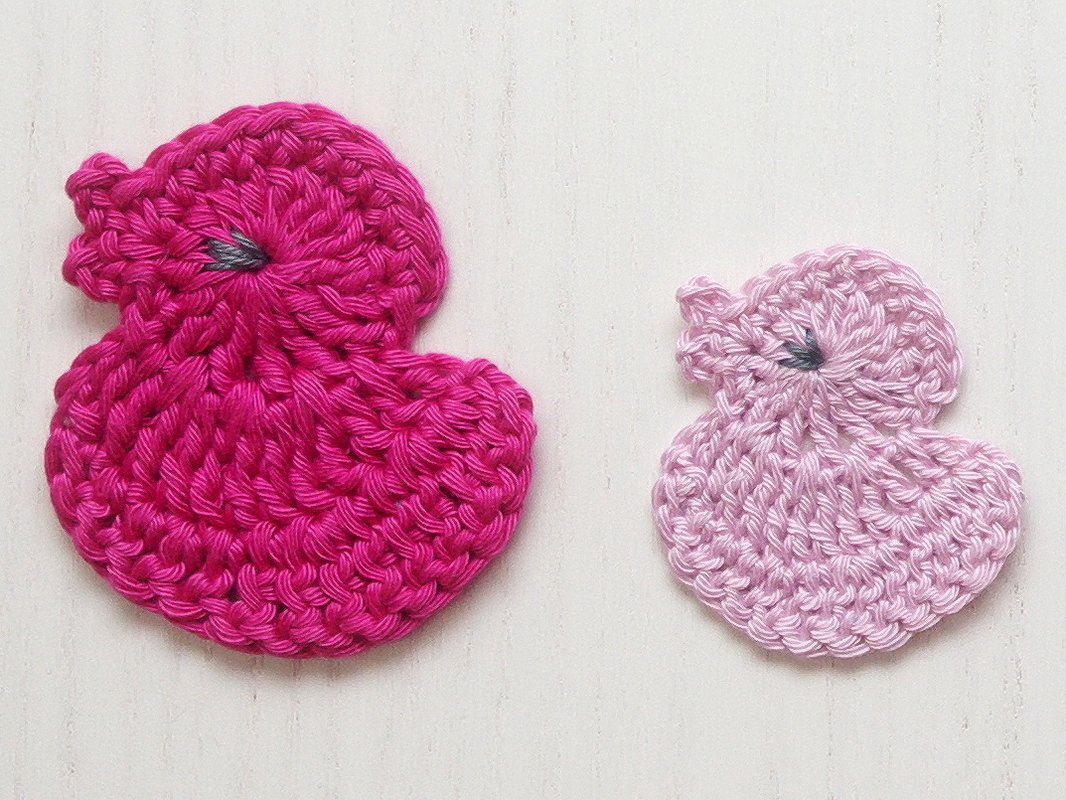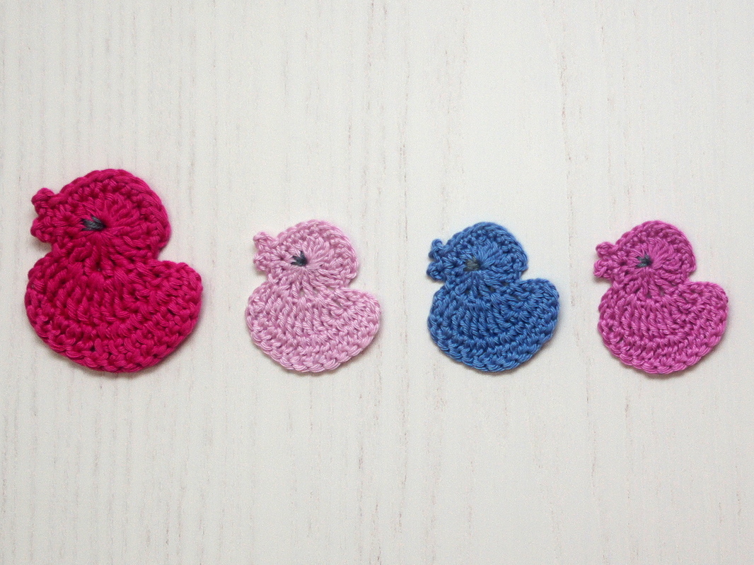 Gehäkelt wurden die gezeigten Enten mit Catania Original von Schachenmayer (100% Baumwolle, LL 125m / 50g), die größere Ente mit Catania Grande ( 100% Baumwolle, LL 63m / 50g). Genutzt wurden für die kleinen Enten eine Häkelnadel in der Stärke 3.5, für die Entenmama eine Häkelnadel Stärke 4.