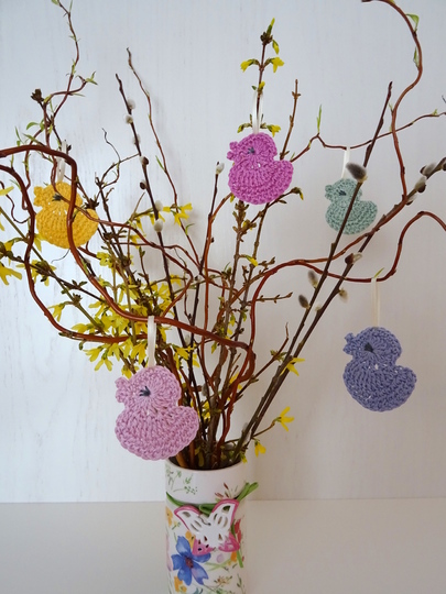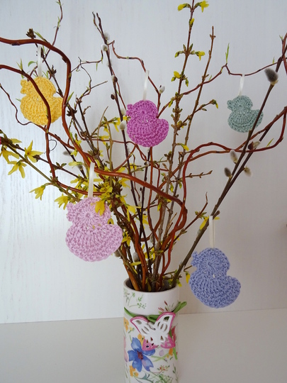 Die kleinen Enten sind wirklich vielfältig zu nutzen- als Osterdekoration am Strauch, als Tischdekoration, vielleicht zusätzlich verziert mit Schleifen, als Anhänger für Geschenke, aber auch die Kinder freuen sich über so süße kleine Entchen. Vielleicht als bezauberndes Mobile für die ganz Kleinen oder eine Entenparade für den Kleiderschrank oder die Kinderzimmertür. Auch als Brosche gehäkelt sind die Enten wirklich zauberhaft.