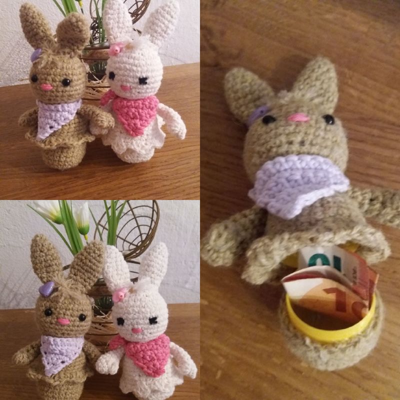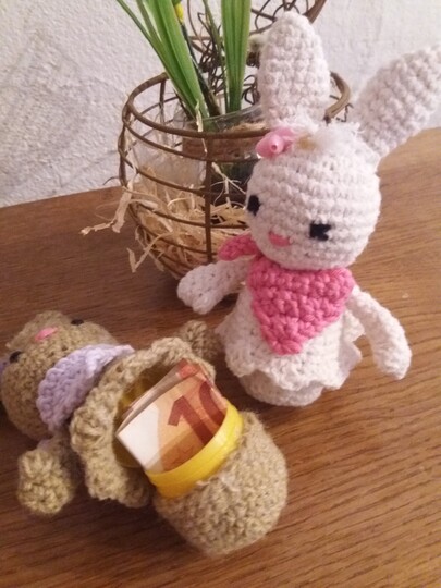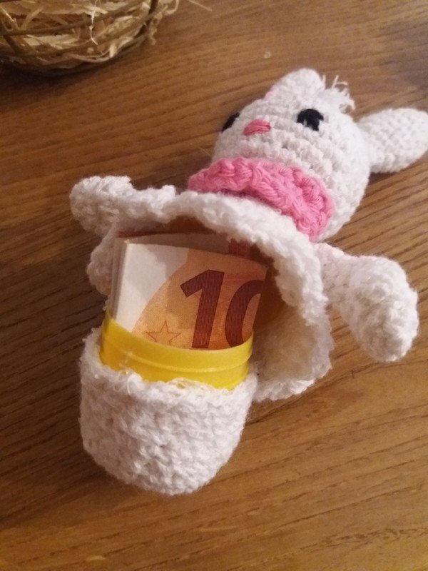 Ich stecke kleine Glückwünsche oder Geldbeträge in den Bauch und staune wie alle begeistert sind, wenn ich ihnen sage damit der Hase noch eine Überraschung im Bauch trägt.