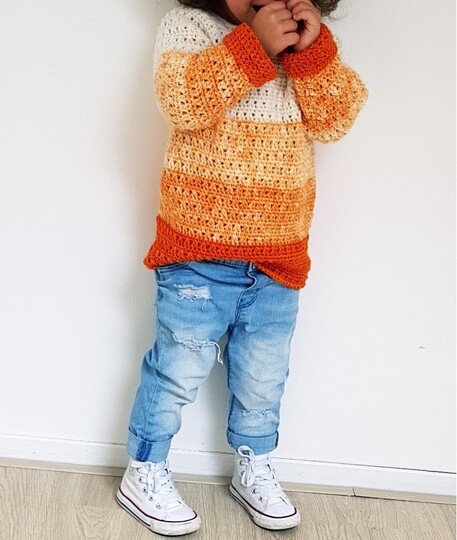 Der Pumpkin Pullover ist ein Pulli mit Raglanärmel und wird von oben nach unten gehäkelt. Der Pumpkin Pullover wird mit Merinowolle von Mayflower gehäkelt. Die Anleitung enthält Größen: 6 monate zu 4-5 jahren.