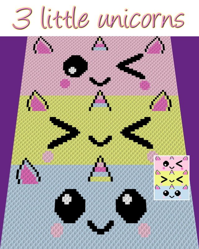3 little unicorns ist ein digitales Diagramm, das für verschiedene Häkeltechniken verwendet werden kann, wie Ecke zu Ecke = C2C, Mini C2C, feste Maschen, halbe Stäbchen, Stäbchen, tunesisch häkeln, Bobble Stitch. Alternativ kann dieses Produkt auch für Kreuzstich, Stricken, Hamma-Perlen, Kunststoff-Leinwand und andere Projekte verwenden werden.