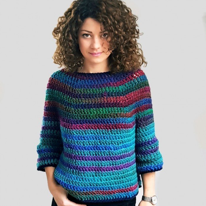 Delighted Pullover wird von oben nach unten gehäkelt und hat eine runde Brustpartie. Der Pulli hat eine lockere Passform. Er ist ca. 16 cm breiter als die durchschnittliche Oberweite (= Umfang Brust). Größe: S-XXL.