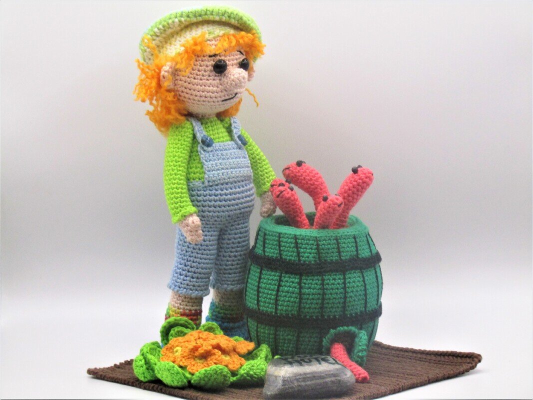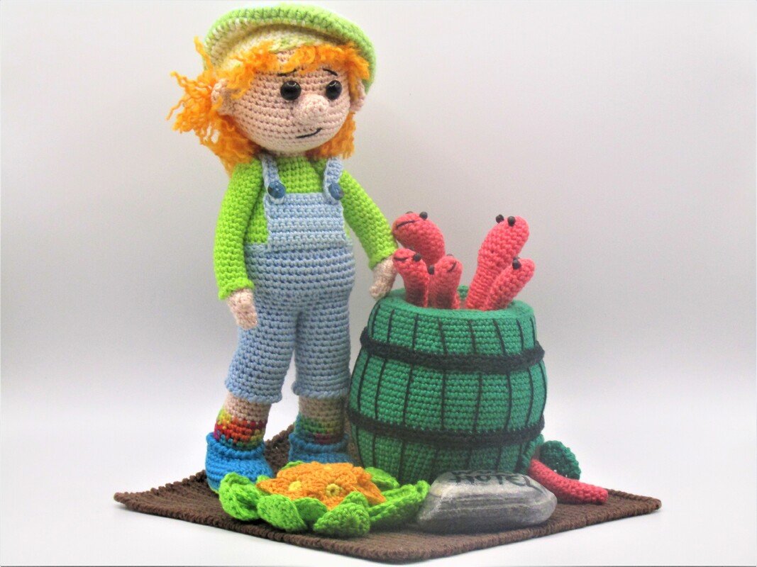 der Körper wird in einem Stück gehäkelt, die Schuhe werden am Schluss am Bein angenäht, die Arme werden Angenäht und die Haarkappe