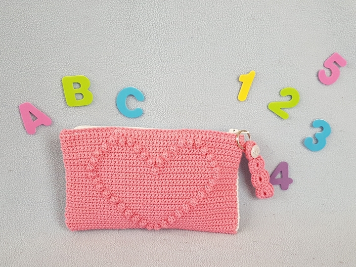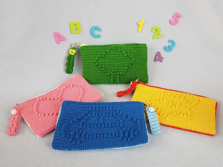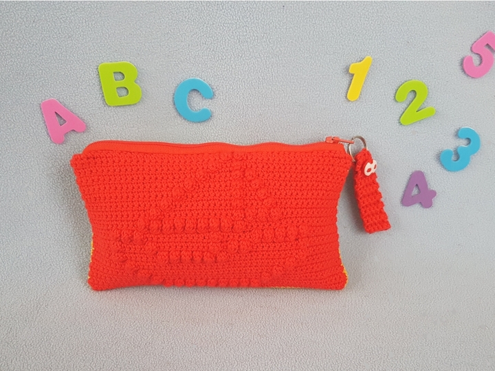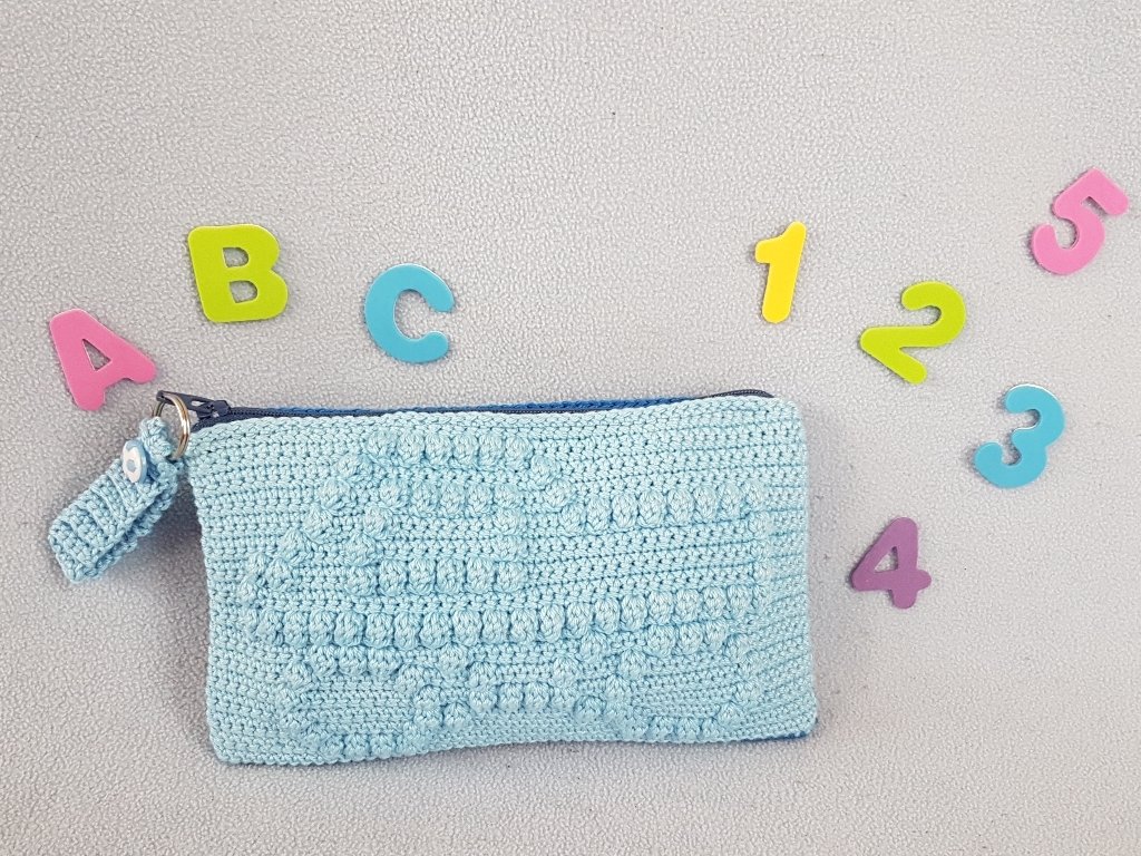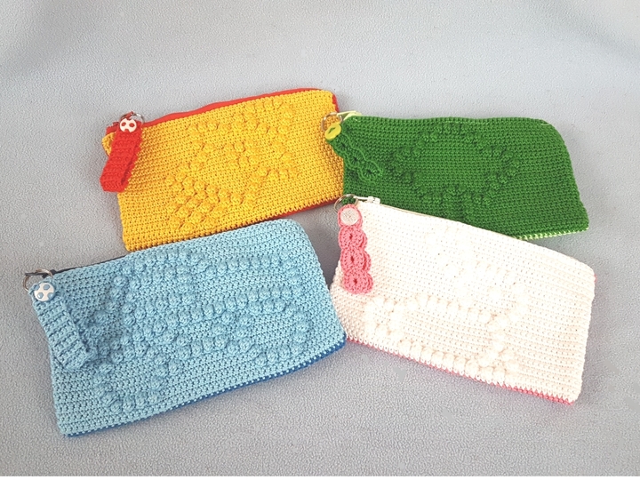 Das Muster der Taschen wird mit Popcornmaschen gehäkelt und verschloßen werden sie mit einem Reißverschluss.