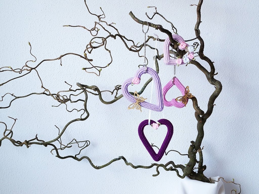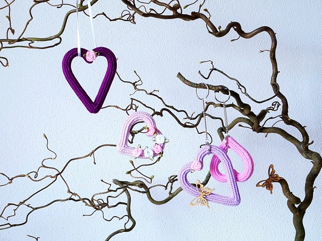 z.B. mit Wolle der Lauflänge 125 m / 50 g gehäkelt werden die Herzen ca. 6.5 cm und 9.5 cm hoch,