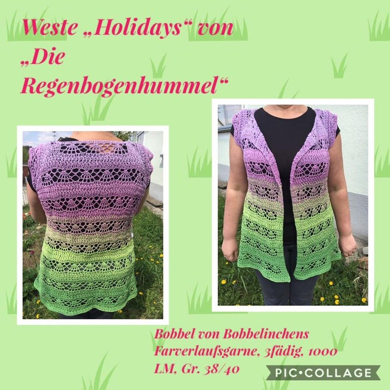 Durch das arbeiten im Rvo Stil ist die Weste super für Farbverlaufsgarne geeignet. Das Garn der Weste stammt von Bobbel-Virus, zu finden bei Facebook.