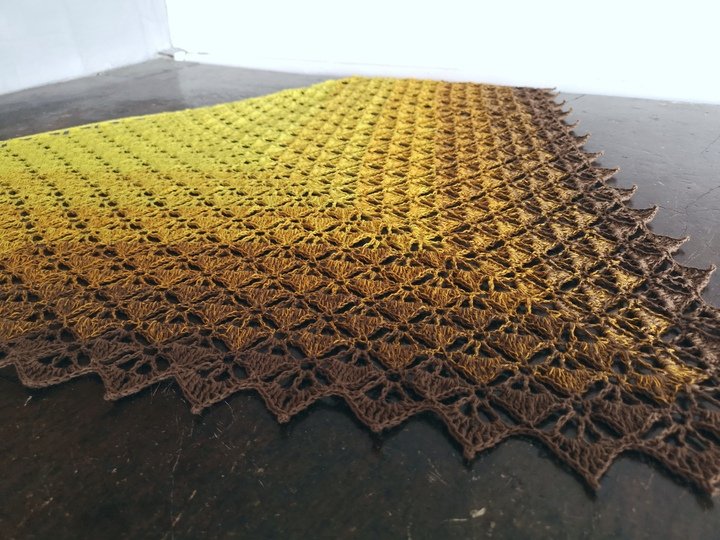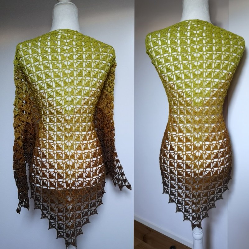 Mit einem 3 fädigen Farbverlaufsgarn mit der LL 200gr/1000m und einer 3.5mm Häkelnadel wird es 170cm lang und 85cm tief.
