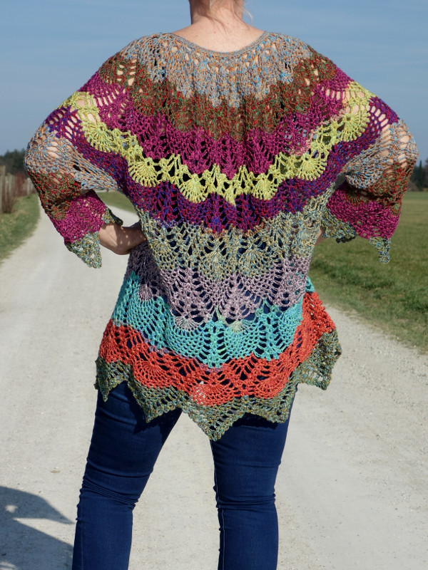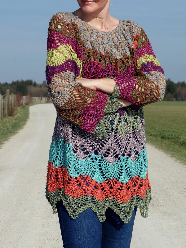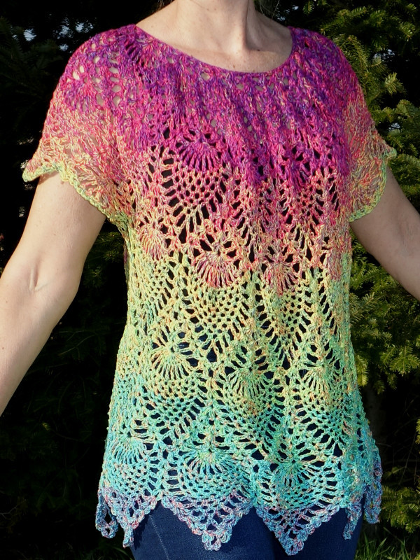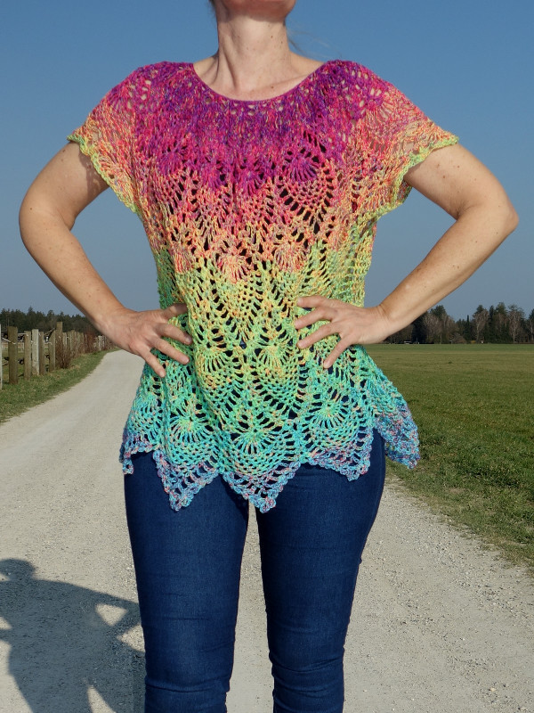 Diese Tunika im Ananasmuster kann für alle Größen von 38 bis Größe 54 angepasst werden.