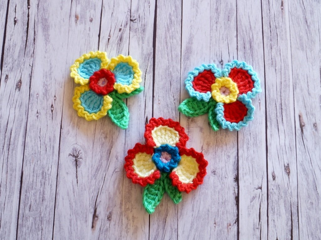 Mit Wolle der Lauflänge 125 m je 50 g gehäkelt wird die Blume ca. 4.5 cm im Durchmesser.
