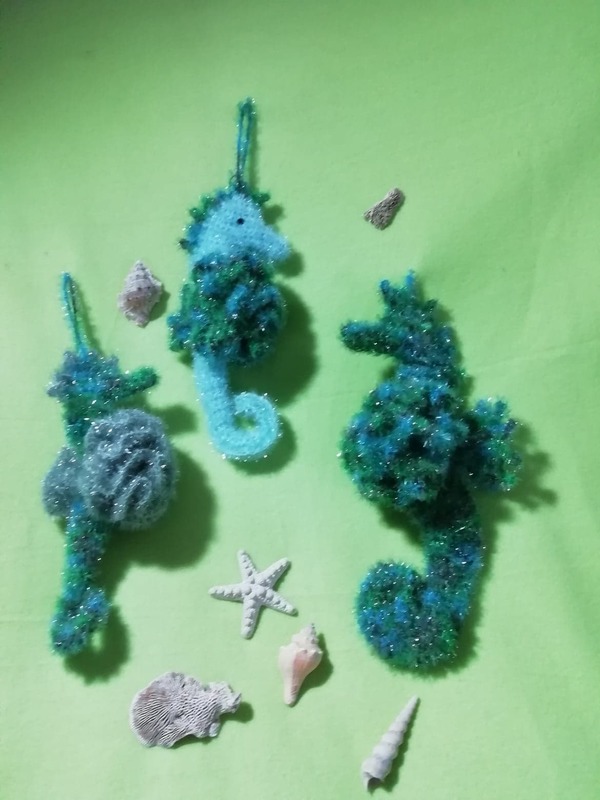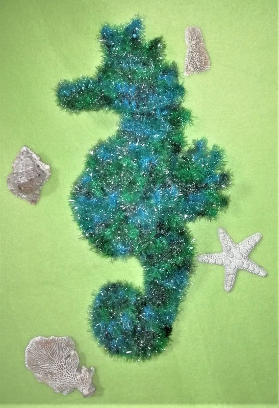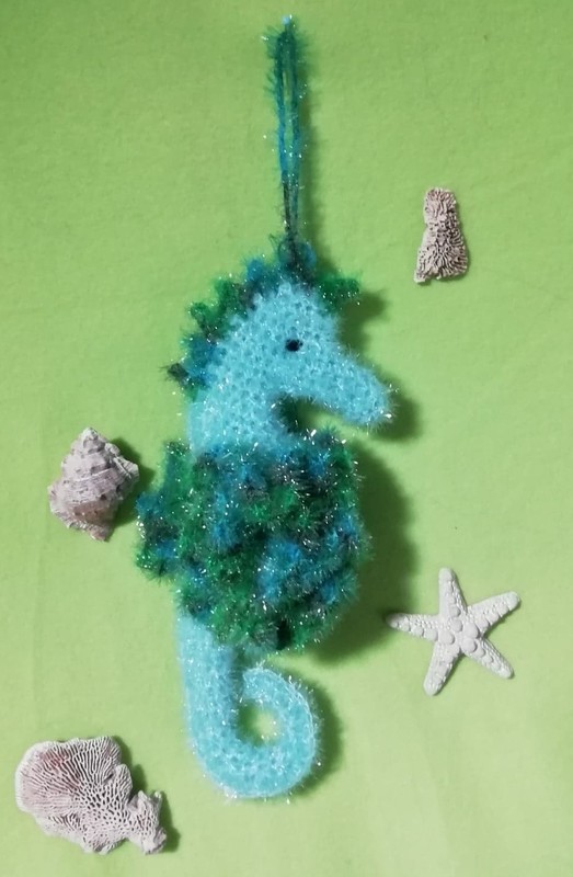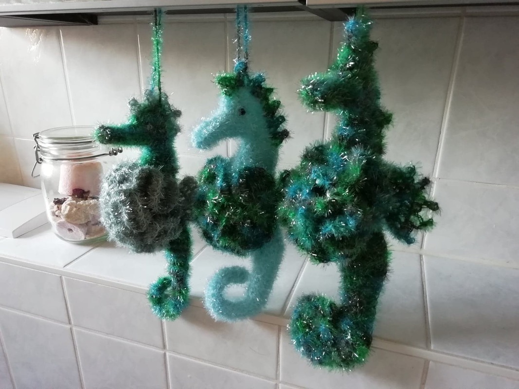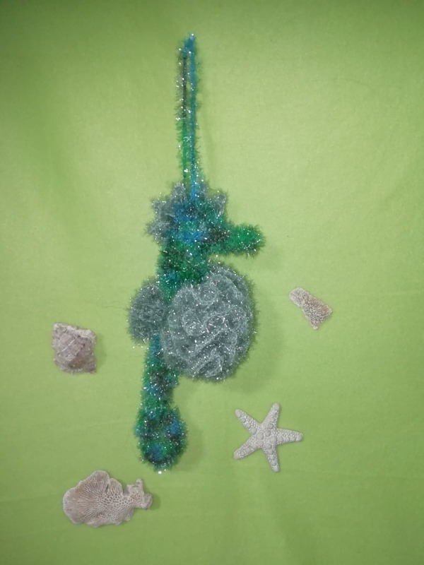Ein Seepferdchen ist ca. 25 cm groß (von Krone bis Schwanz), der Puschel hat einen Durchmesser von etwa 10 cm.