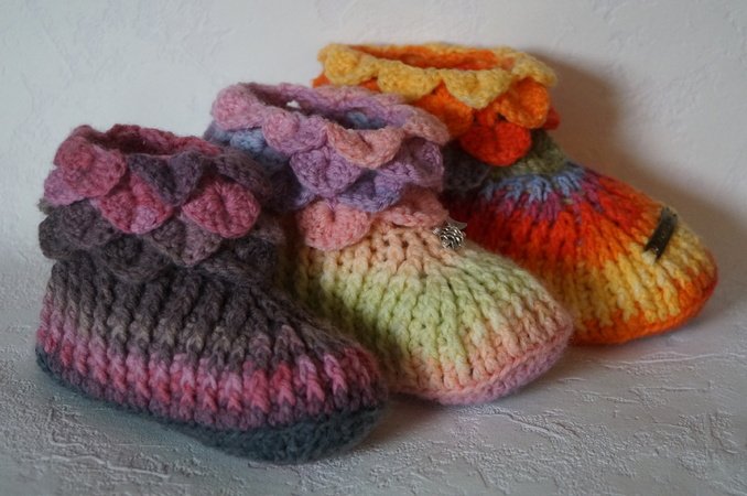 Ich habe die Anleitung für Wolle mit ca. 360 meter / 100 gramm und Nadelstärke 3,5 mm geschrieben. Ich könnt aber auch Wolle in anderer Dicke verwenden, denn die Anleitung ist für 13 verschieden Größen geschrieben und bei dickerer oder dünnerer Wolle kann einfach eine andere Größe gehäkelt werden. Außerdem werden diese Schuhe schön weich und dehnbar so dass sich auch über mehrere Größen tragbar sind.