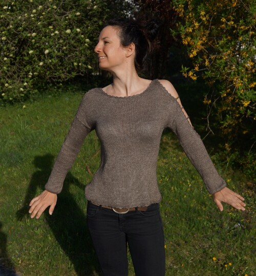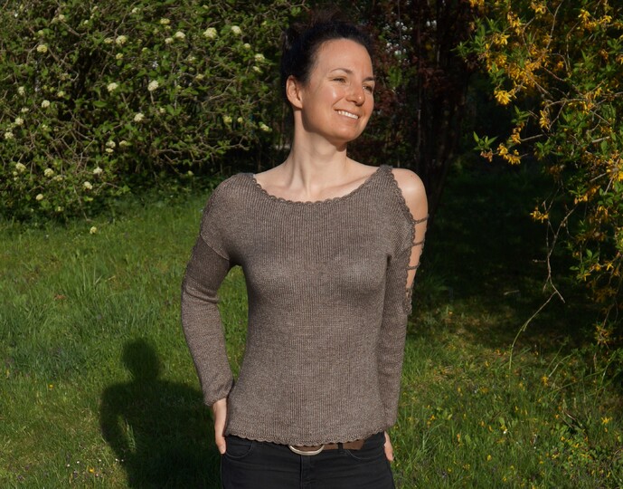 Der Pullover im Bild wurde mit dem Garn Yeti von“ Seehawer Naturfasern“, Farbe braun-meliert gestrickt. Es eignet sich jedes Sommergarn, das eine Lauflänge von ca. 230m/50gr hat und mit Nadelstärke 2,5 o.ä. gestrickt werden kann um auf folgende Maschenprobe zu gelangen: